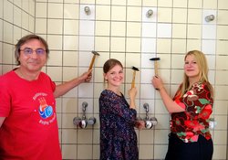 Foto 1: Nils Zurawski (Hamburger Rugby-Verband), Isabel Permien (GRÜNE) und Lena Otto (SPD) in den maroden Duschen des Verbandshauses (© Reiffert/GRÜNE Hamburg-Nord)