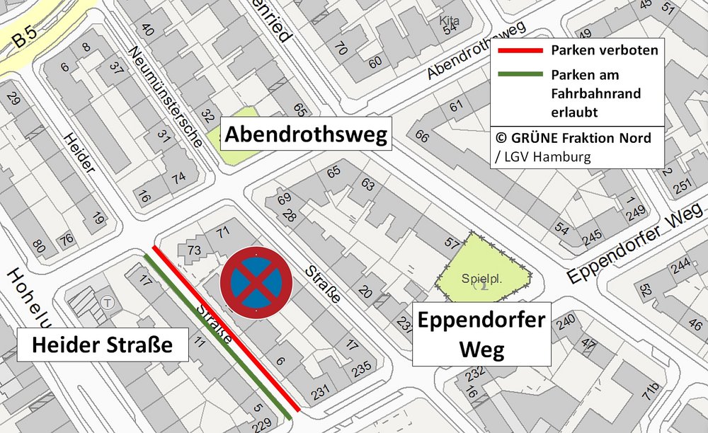 Im Moment dürfen die Autos auf beiden Seiten der Heider Straße halb auf dem Gehweg parken. Das lässt aber den Fußgänger*innen so wenig Platz, dass kaum zwei Menschen aneinander vorbei kommen – von Corona-Abständen ganz zu schweigen. In Zukunft darf nur noch auf der Seite mit den ungeraden Hausnummern am Fahrbahnrand geparkt werden – gegenüber gar nicht mehr. Damit gewinnt der Fußverkehr den Platz, den er dringend braucht.“