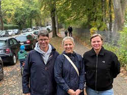Foto: Thomas Kehrer (l., Elternrat Carl-Cohn-Schule, Katharina Fischer-Zernin (m., GRÜNE Sprecherin für Mobilität und Susann Karras (r, Vorsitzende des Elternrats), auf dem Gehweg vor der Carl-Cohn-Schule © Maria Kolla-Andreovits
