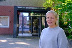 • Fotos: Katharina Fischer-Zernin, GRÜNE Sprecherin für Mobilität, vor der Grundschule an der Barmbeker Brucknerstraße (Reiffert/GRÜNE Fraktion Nord)
