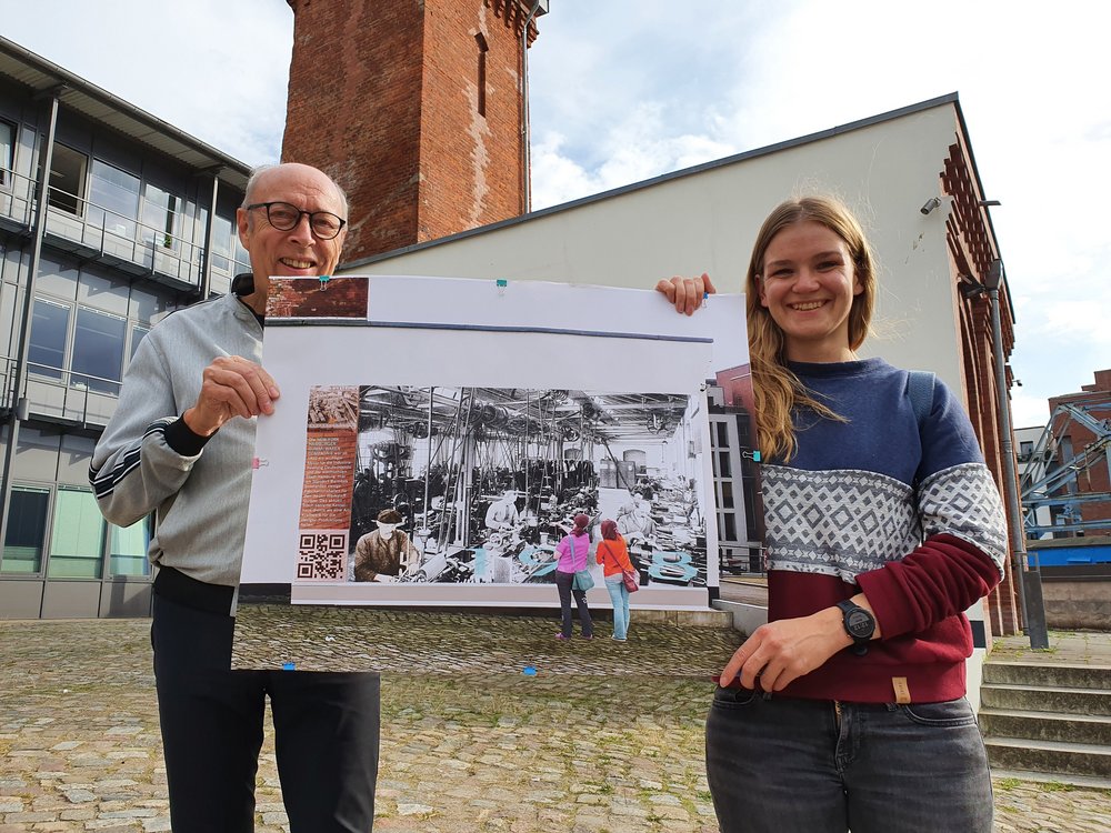 Bild: Werner Krömeke (links) und Isabel Permien mit dem Entwurf der Bildinstallation auf dem Barmbeker Museumshof (Foto: Lamparter/GRÜNE-Fraktion)