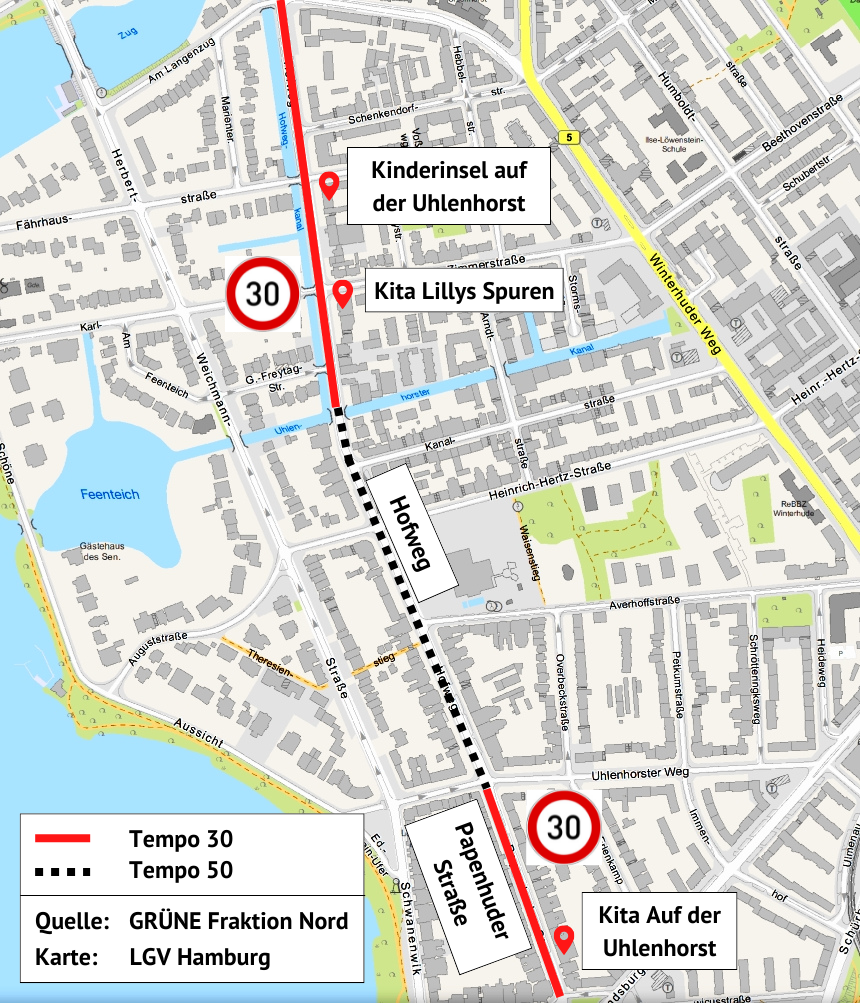 Die geänderte Straßenverkehrsordnung hat die Einführung von Tempo 30 vor Schulen, Kitas, Krankenhäusern sowie Senior*innen- und Pflegeeinrichtungen stark vereinfacht. In der Papenhuder Straße betrifft dies den Bereich vor der KiTa „Auf der Uhlenhorst“. Zwischen Hausnummer 22 und 67 wird auf 300 Metern Tempo-30 eingerichtet. Einige hundert Meter weiter auf dem Hofweg wird vor den Einrichtungen „Kita Lillys Spuren“ und „Kinderinsel auf der Uhlenhorst“ zusammengefasst eine Strecke von 500 Metern verkehrsberuhigt. Somit gilt dann auf mehr als der Hälfte der Strecke zwischen Mundsburger Damm und Mühlenkampbrücke Tempo 30.