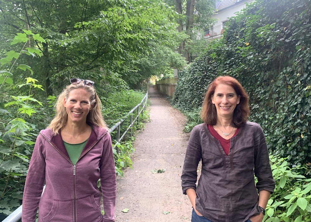 Foto: Katrin Hofmann (rechts, GRÜNE stellv. Fraktionsvorsitzende und Sprecherin für Ohlsdorf) und Katrin Baum (links, GRÜNES Mitglied aus Klein Borstel) freuen sich, dass der Erhalt des Zugangs zum Alstertal am Schluchtweg nun näher gerückt ist (Foto: Hofmann)