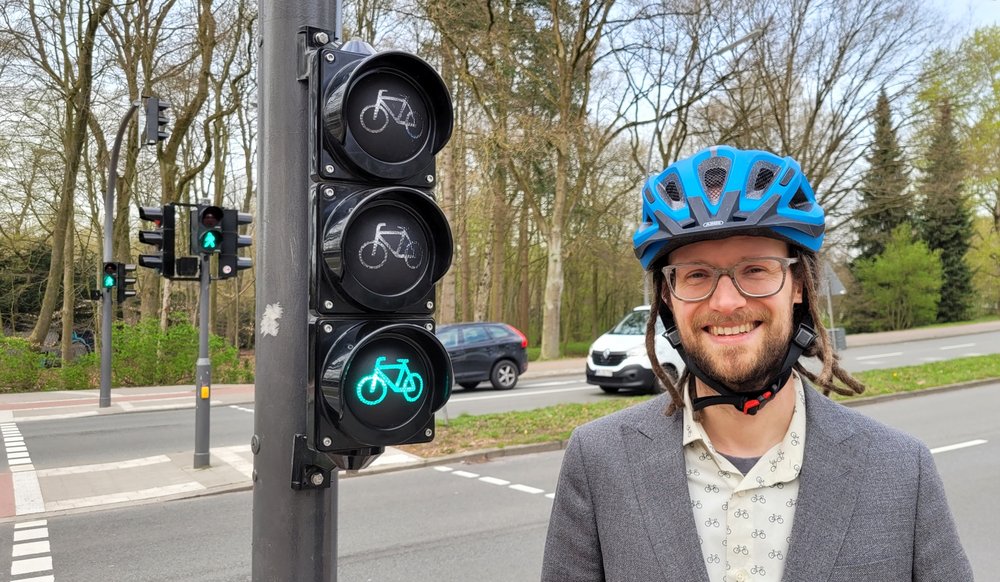 Foto: Thorsten Schmidt an der Ampel Saarlandstraße/Veloroute 5N, die nun regelmäßig automatisch Grün wird (Reiffert/GRÜNE Fraktion Nord)
