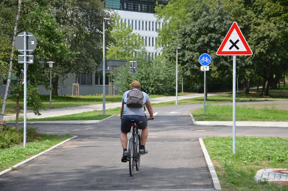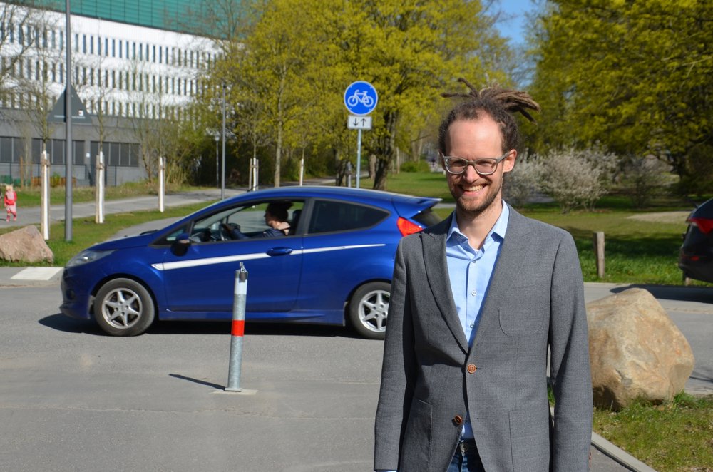 Foto: Thorsten Schmidt an der Kreuzung Veloroute 5 / Dakarweg – noch gilt Rechts-vor-Links (Reiffert/GRÜNE Fraktion Nord)