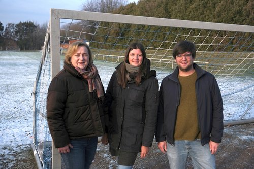 Foto: (v.l.n.r.) Angelika Bester (SPD), Ann-Christin Schwenke (Sportclub Alstertal-Langenhorn e.V.), Timo Kranz (Grüne) besichtigen den jetzigen Zustand der Sportanlage. (Foto: Reiffert/GRÜNE Nord)
