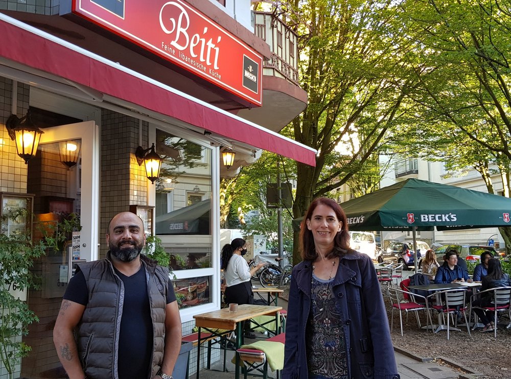 Foto: Katrin Hofmann (rechts) und Fadi Al Saifi, Inhaber des Restaurants Beiti an der Als-terdorfer Straße (Reiffert/GRÜNE Fraktion Nord)