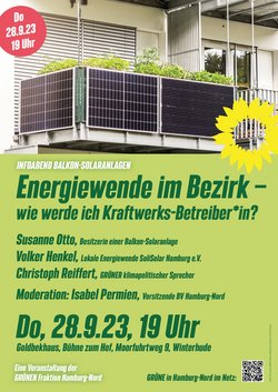 Wenn Deutschland und Hamburg ihre Klimaziele einhalten wollen, müssen sich alle beteiligen. Dabei denken viele Menschen nicht nur darüber nach, wie sie Energie sparen, sondern auch, wie sie diese klimaverträglich selbst produzieren können. In unserem Infoabend werfen wir zunächst einen Blick auf die klimapolitischen Ziele des Bezirks Hamburg-Nord. Wir werden dann mit einem Experten vom Hamburger Verein SoliSolar darüber sprechen, wie auch Mieter*innen mit Balkon-Solaranlagen selbst Strom erzeugen und damit CO2 einsparen können. Die Besitzerin einer solchen Anlage berichtet danach aus der Praxis.