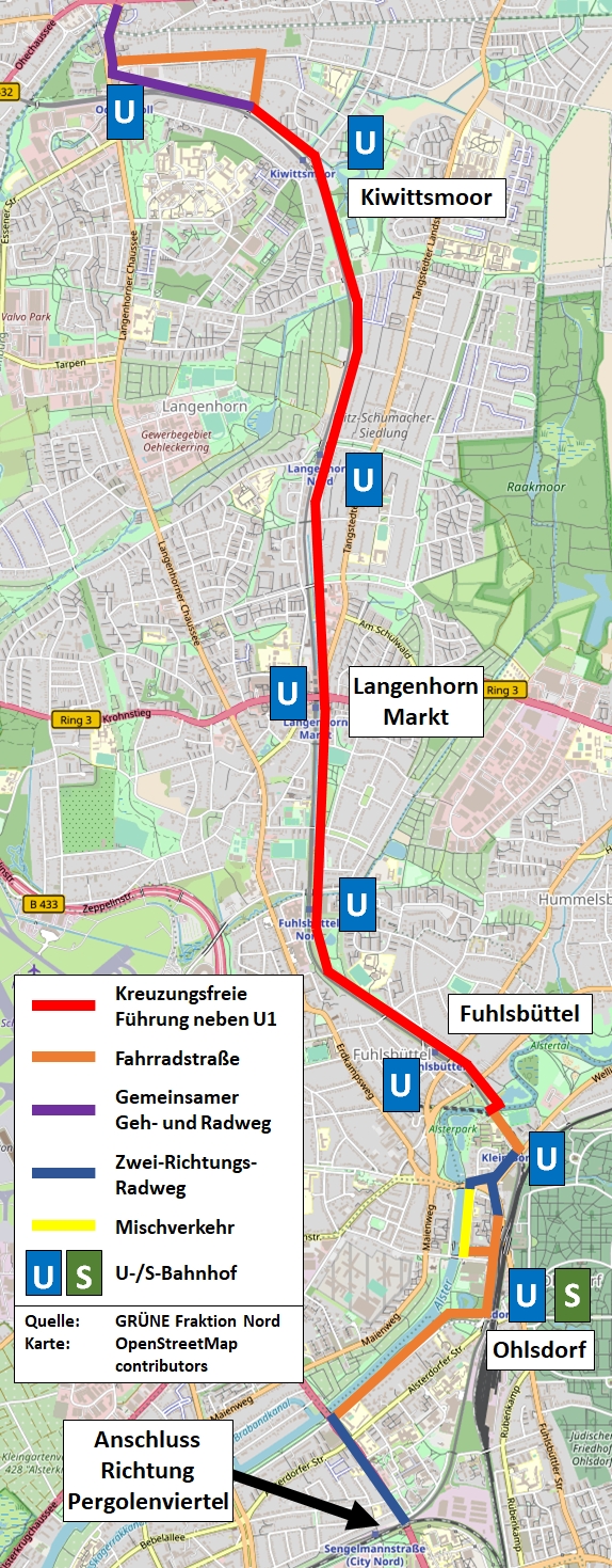 Karte: Hier soll der Radschnellweg Hamburg-Nord verlaufen (mit Art der Radverkehrsführung)