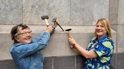 • Foto: Käthe Fromm (GRÜNE, li.) und Lena Otto (SPD, re.) öffnen symbolisch den historischen Ost-Eingang am U-Bahnhof Saarlandstraße (Reiffert/GRÜNE Fraktion Hamburg-Nord)