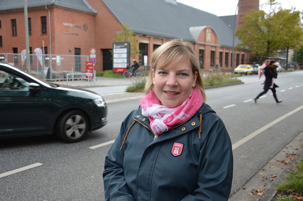 Foto: Simone Dornia an der Querungshilfe über die Fuhlsbüttler Straße (Reiffert/GRÜNE Fraktion Nord)