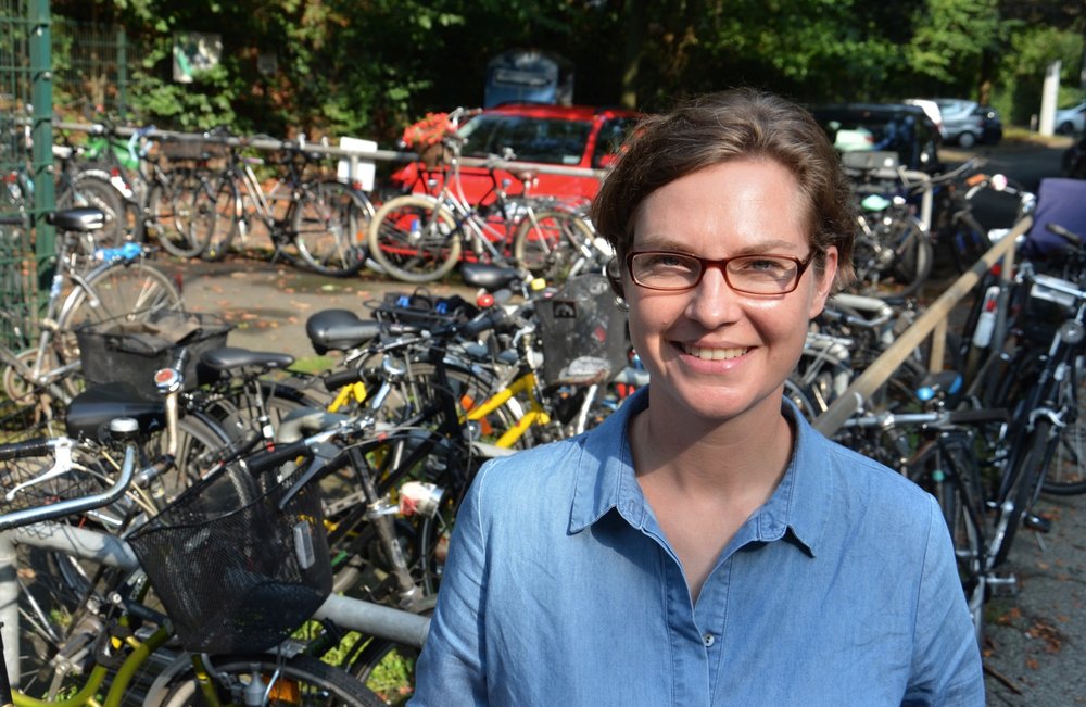 Foto Sina Imhof an der Radabstellanlage U Lattenkamp – dort werden mehrere neue Anlagen gebaut (Reiffert/GRÜNE Fraktion Nord)