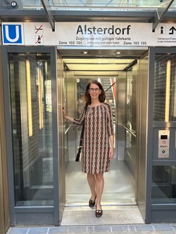 • Foto: Katrin Hofmann am neuen Aufzug in der U-Bahn-Station Alsterdorf (Damm/GRÜNE Fraktion Nord)