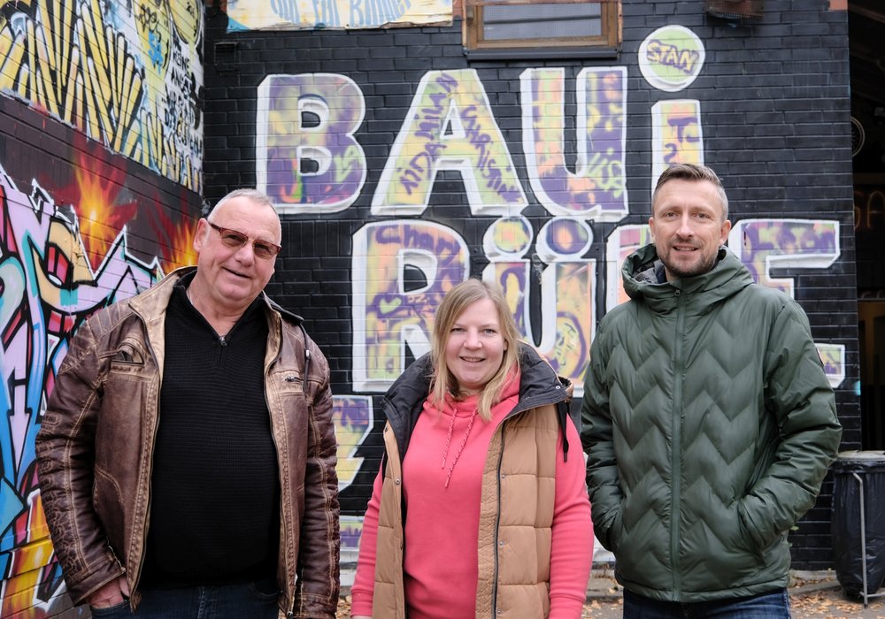 Foto (Reiffert/GRÜNE Fraktion Nord): Von links: Rüdiger Wendt (SPD), Simone Dornia (GRÜNE) und Philipp Noß (SPD) auf dem Bauspielplatz Rübezahl
