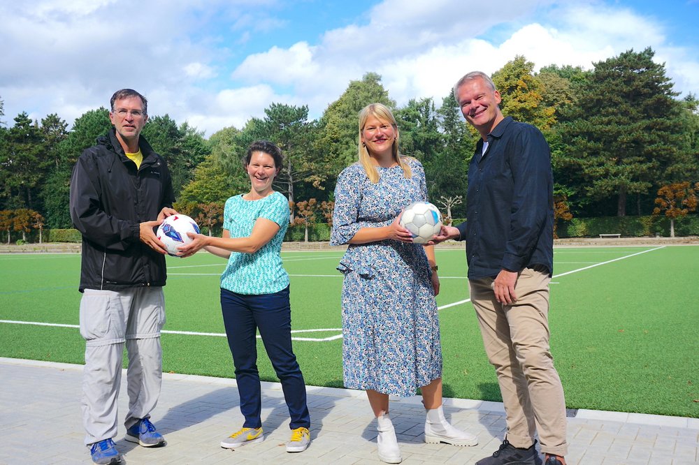 Foto: (v.l.n.r.) Oliver Camp (GRÜNE), Kathrein Aßmann (VfL 93 Hamburg), Lena Otto (SPD) und Jörg Timmermann (VfL 93 Hamburg) vor dem neuen Kunstrasenplatz im Borgwegstadion. (© SPD-Bezirksfraktion Nord)