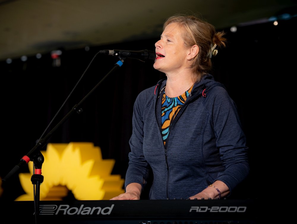 Nach einem kurzen musikalischen Auftakt durch Bernadette La Hengst und Claudia Wiedemer, blickten Timo B. Kranz (Fraktionsvorsitzender), Priscilla Owosekun-Wilms (Vorsitzende der Bezirksversammlung) und Katrin Hofmann (Stellv. Fraktionsvorsitzende) mit einigen ihrer Vorgänger*innen aus den letzten Jahrzehnten auf den Werdegang der GRÜNEN Fraktion im Laufe der Jahrzehnte zurück.