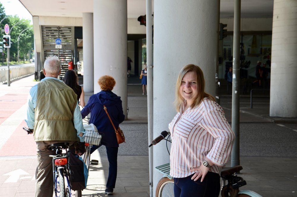 Foto: Simone Dornia an der neuen Fahrradampel Einmündung Heitmannstraße/Hamburger Straße