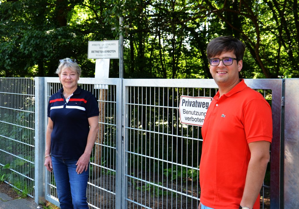 Foto: Martina Schenkewitz und Timo B. Kranz am zeitweise gesperrten Tarpenbek-Wanderweg (Reiffert/GRÜNE Fraktion Nord)