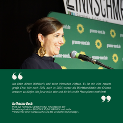 „Ich liebe diesen Wahlkreis und seine Menschen einfach. Es ist mir eine extrem große Ehre, hier nach 2021 auch in 2025 wieder als Direktkandidatin der Grünen antreten zu dürfen. Ich freue mich sehr und bin bis in die Haarspitzen motiviert!“ - Katharina Beck MdB