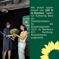 Wir haben uns entschieden! Mit einem klaren Votum von 100 % Ja-Stimmen wurde Katharina Beck als Direktkandidatin für die Bundestagswahl 2025 im Wahlkreis 021 Hamburg-Nord/Alstertal aufgestellt.