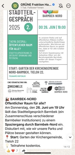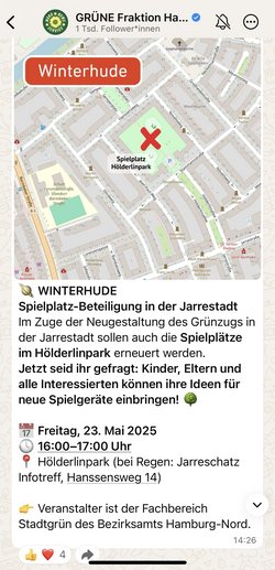 Der Kanal „Grüne Fraktion Hamburg-Nord“ zählt bereits über 1.000 Abonnent*innen – und richtet sich an alle Menschen im Bezirk, die sich für lokalpolitische Entwicklungen, Beteiligungsformate und nachbarschaftliches Engagement interessieren.