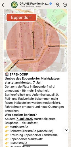 Der WhatsApp-Kanal bündelt Themen kompakt, ergänzt durch Links, Bilder und persönliche Einblicke in die kommunale Arbeit. Dabei bleibt der Kanal bewusst kommentarfrei, für die Nutzenden anonym und übersichtlich – ideal für Menschen, die einfach wissen wollen, was in ihrem Stadtteil los ist und wo sie sich einbringen können, ohne sich durch lange Newsletter oder Social Media scrollen zu müssen.