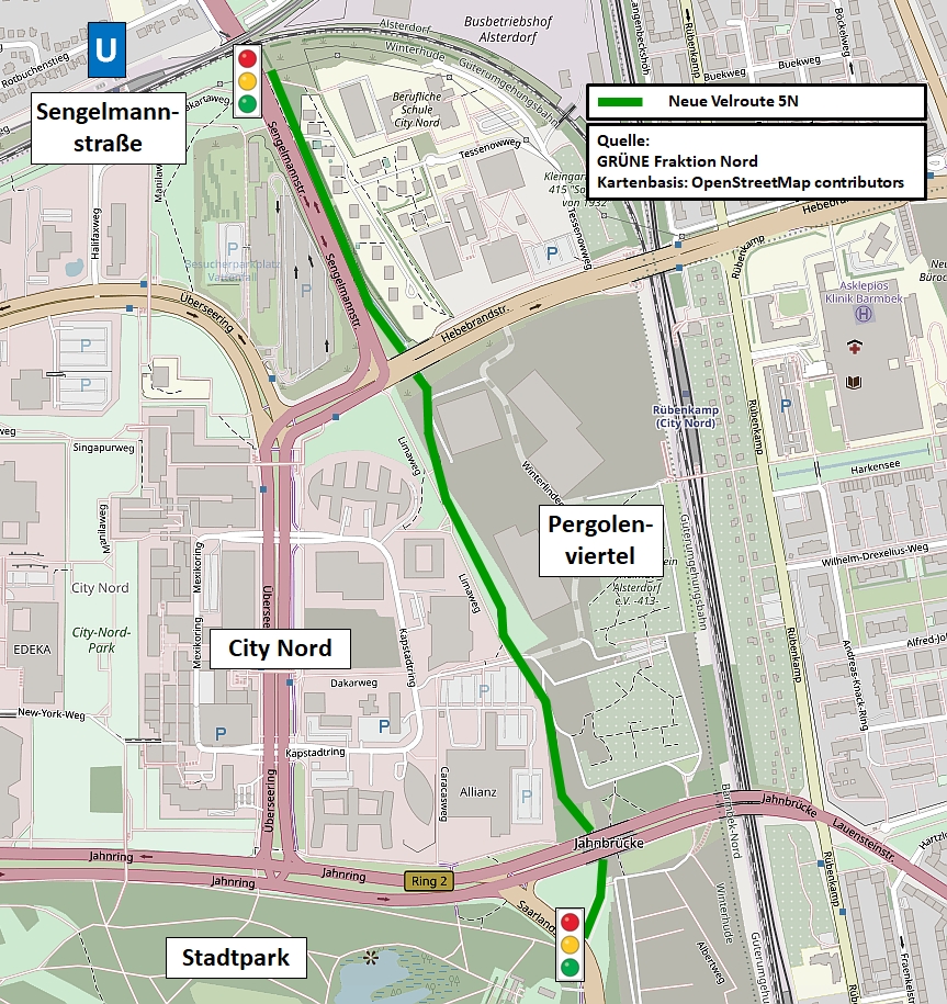 Die sogenannte Veloroute 5N führt nun vom nördlichen Ende der Saarlandstraße unter der Jahnbrücke hindurch, zwischen City Nord und dem neu entstehenden Pergolenviertel entlang, unter der Hebebrandstraße hindurch bis zur Ampel über die Sengelmannstraße auf Höhe des gleichnamigen U-Bahnhofes (s. Anlage).
