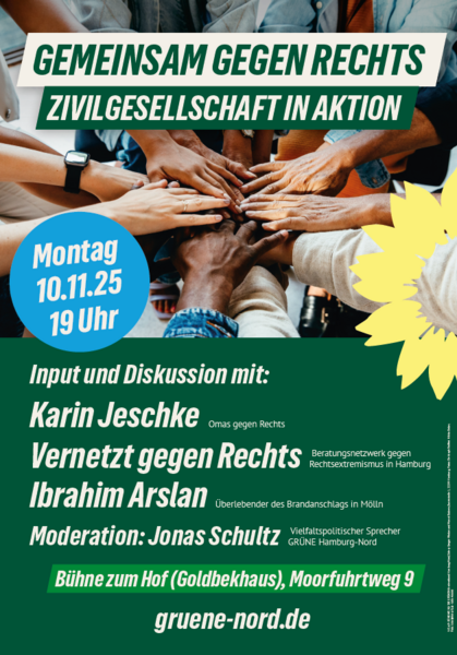 Die demokratische Zivilgesellschaft ist das Rückgrat unserer offenen Gesellschaft – und sie steht heute mehr denn je unter Druck. Mit unserer Veranstaltung „Gemeinsam gegen Rechts – Zivilgesellschaft in Aktion“ am 10.11.2025 um 19 Uhr im Goldbekhaus (Bühne zum Hof) wollen wir zeigen, wie Engagement, Aufklärung und Solidarität unsere Demokratie stärken können.