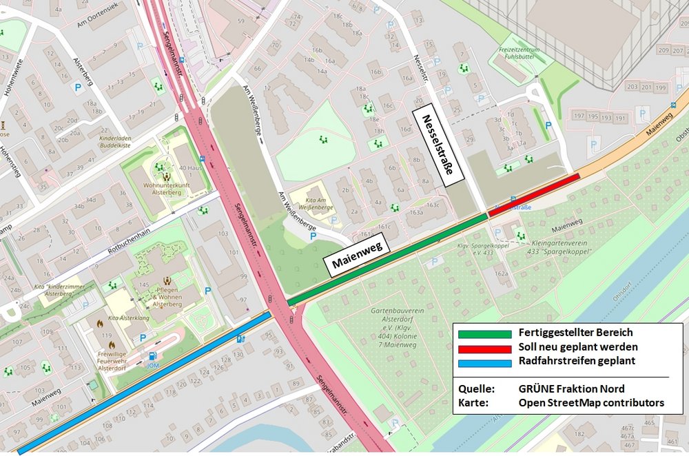 Bereits im März 2014 wurden die Verkehrsplanungen für das Neubaugebiet in Ohlsdorf im Regionalausschuss vorgestellt. Die Umsetzung stockt bisher jedoch, da der endgültige Ausbau der Straßenflächen erst nach der Beendigung der Hochbautätigkeiten vorgenommen werden soll. Laut Verkehrsplanung für den Maienweg ist auf der Südseite ein Radfahrstreifen und auf der Nordseite westlich der Nesselstraße ein Hochbordradweg hinter den Bäumen vorgesehen. Dieser Abschnitt ist bereits fertiggestellt. Östlich der Nesselstraße jedoch ist für die Strecke von 130 Metern bis zur Planungsgrenze kurz hinter der Gertrud-Meyer-Straße keine Radverkehrsanlage geplant. Um die Sicherheit für den Rad- und Fußverkehr zu gewährleisten, müssen diese Pläne noch vor der Umsetzung so angepasst werden, dass eine sichere, komfortable und schnelle Führung des Radverkehrs auf allen Abschnitten des Maienweges möglich wird.