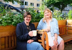 • Foto (vlnr): Nadja Grichisch (GRÜNE) und Lena Otto (SPD) genießen eine Tasse Kaffee auf einem Parklet am Eppendorfer Weg 169 (Hoheluft-West) (Reiffert/GRÜNE Fraktion Nord)